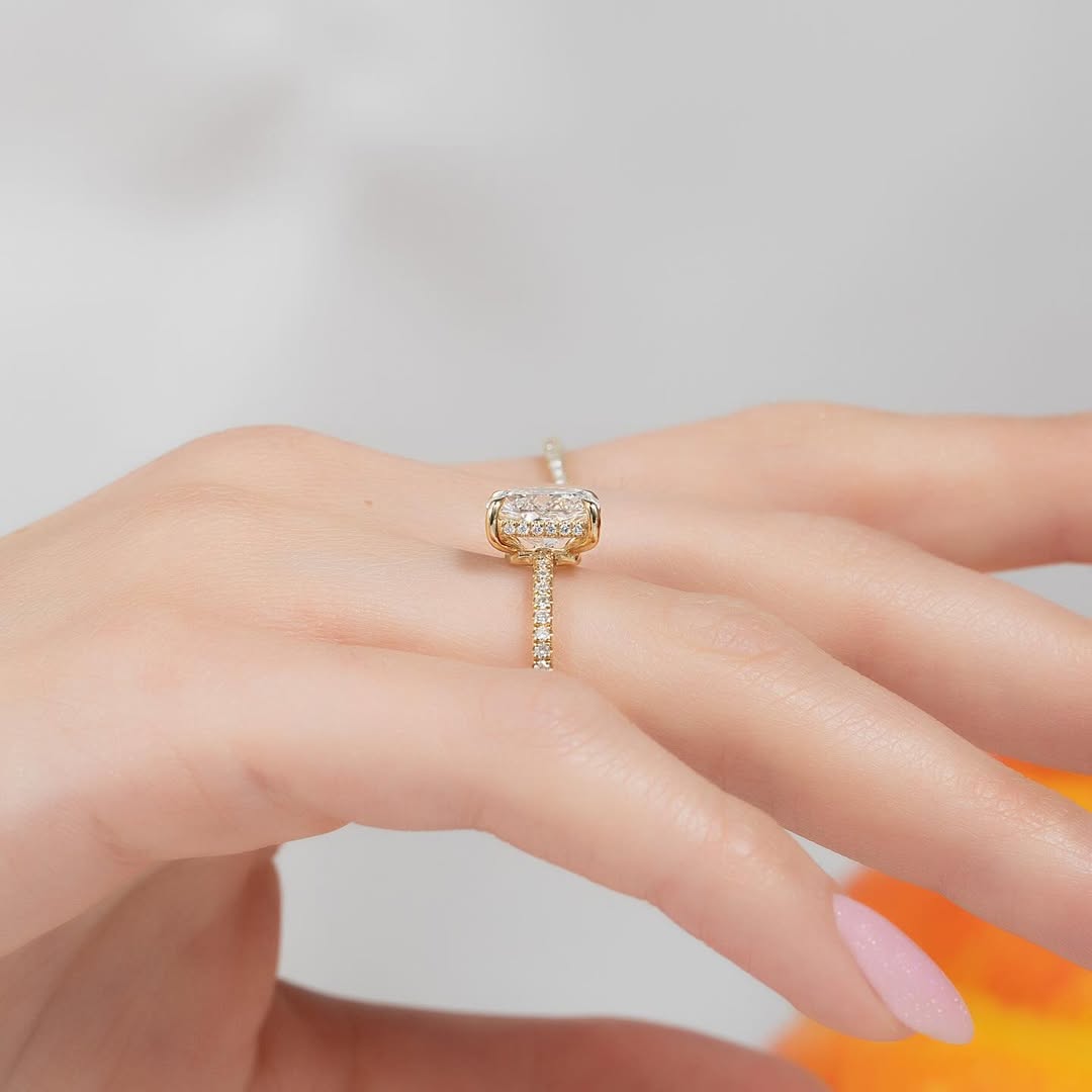 2.50ct Cushion Cut Lab Grown Diamond Solitaire Ring With Pave Band & Hidden Halo