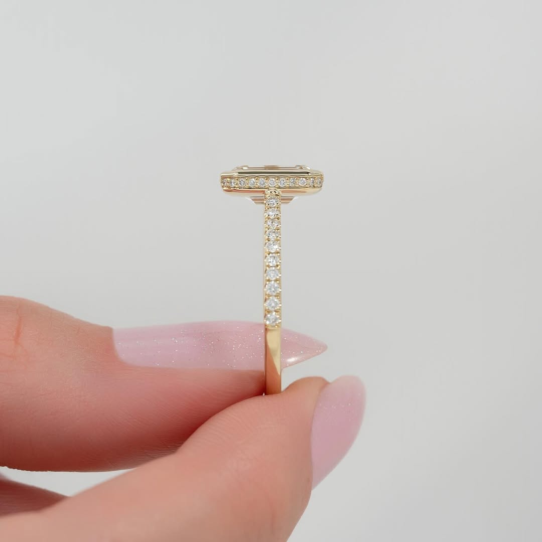 2.0ct Emerald Cut Lab Grown Diamond Solitaire Full Bezel Ring With Pave Band & Hidden Halo